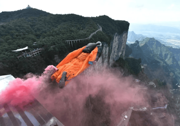 本届赛事有“弯道竞速”与“精准穿靶”两大经典项目,起跳台设于天门山顶玉壶峰,海拔高度达1458米,起跳点与降落点垂直落差990米空中直线距离约1.3公里。参赛者需要从海拔1400余米的跳台起跳,以超200公里的时速“人箭”般击穿靶标。