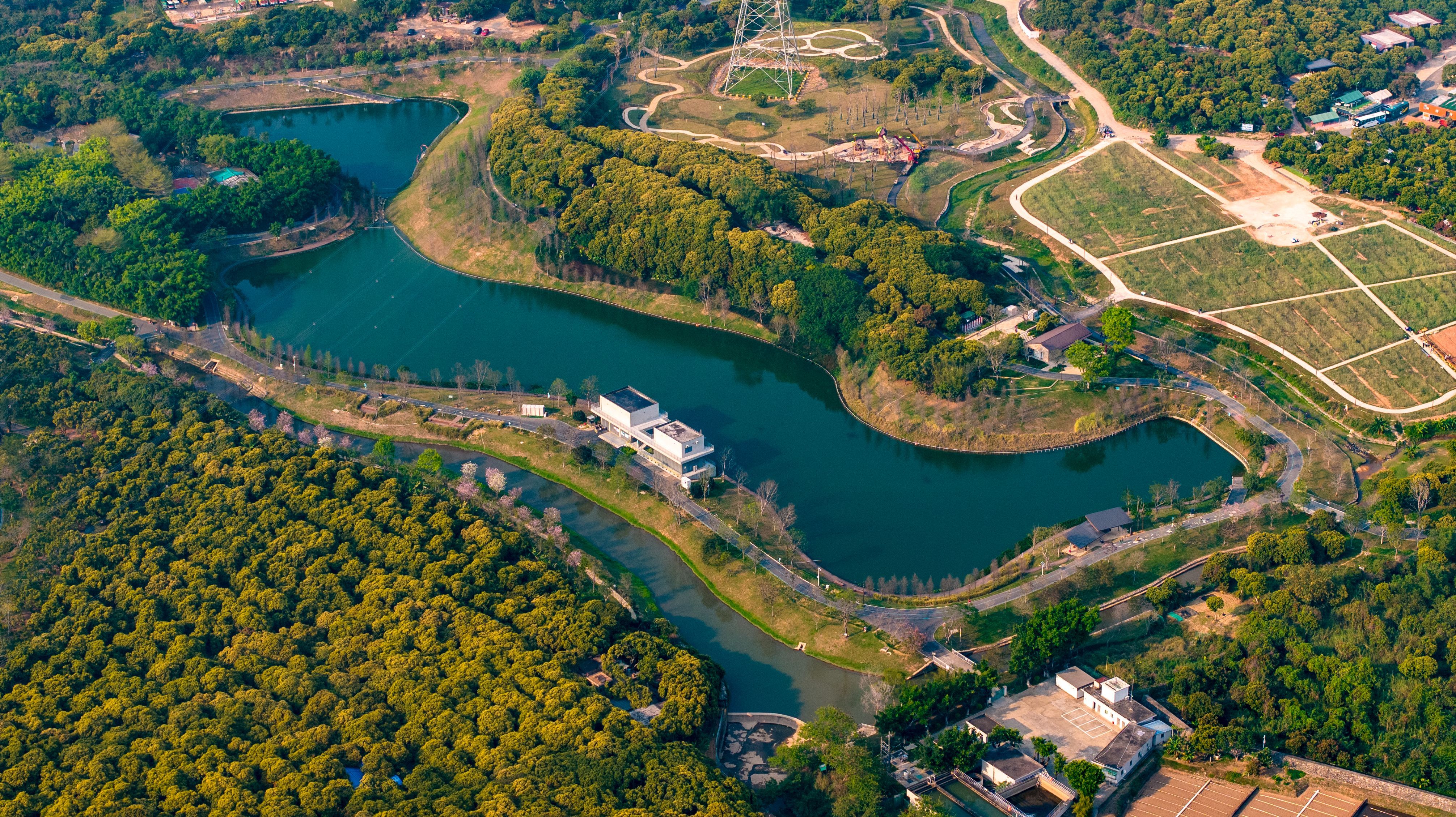 从写意三河沿着绿道往东边走,就来到了横塘垂砚。笔状的驿站建筑体横跨池塘,如墨笔搁于砚盘上。这里原本是一座受污染的人工鱼塘,如今通过“水下森林”技术,通过景观再生形成可以净化水质的“蓝岛”,实现水体的生态综合治理。