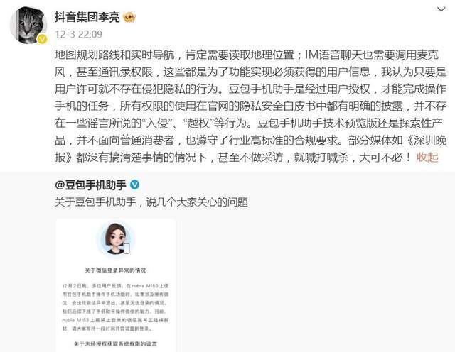 围绕隐私权限等争议,抖音集团副总裁李亮强调: