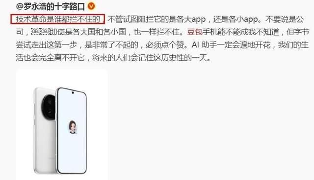 朱海舟的前老板、初代网红罗永浩也对豆包AI手机不吝赞美,他表示,技术革命是谁都拦不住的,不管试图阻拦它的是各大app,还是各小app……也一样拦不住。字节尝试走出这第一步,非常了不起,必须点赞。