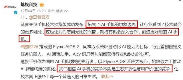 此外,魅族科技也第一时间向豆包抛去了橄榄枝,称豆包手拓展了AI手机的想象边界,让行业看到了技术融合的更多可能,也让我们感到无比的兴奋,期待深入合作,创造更好用的AI手机……